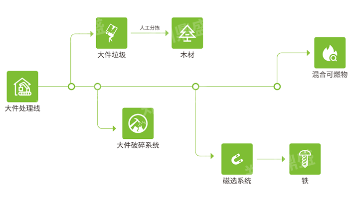 大件垃圾處理係統通過破碎、磁選、篩分、除塵等(děng)工藝(yì)流(liú)程,可以高效分選出大件垃圾中的織物、海綿、木材、鐵磁料等物料(liào),可通過“破碎+分選”工藝快(kuài)速實現對(duì)大件(jiàn)垃圾的減容和初步資源化處理,降低存放和運輸成本(běn)。也可以通過(guò)“多級破碎+多級分選”工藝實現(xiàn)對大件垃圾(jī)自動分類處理,資源化利用(yòng)程度高,而且更適合混合型大件垃圾的處理。