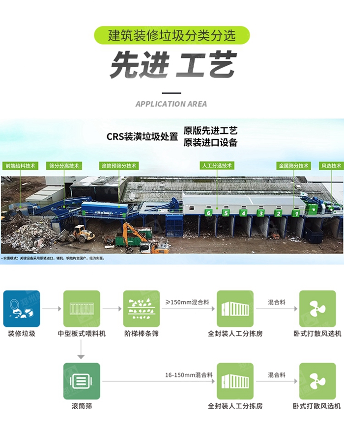 建築裝修垃圾資源化高效利用的前提是先進(jìn)的工藝,鄭州鼎(dǐng)盛采用來自全球固廢設備製(zhì)造中心北愛爾蘭CRS公司以“分類、分揀、分離”為核心的原版先進工藝,並根(gēn)據國內不同原料條件進行適當的調整、補充和增強,推出(chū)CRS標(biāo)準原版、增強版與高配版三種處置工藝方案。