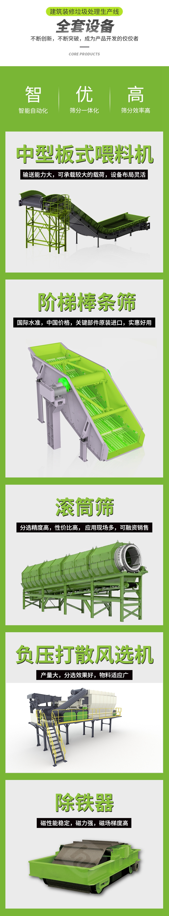 分類工序每(měi)個廠家推薦的篩分設備都不一樣,有滾筒篩、指形篩(shāi)、階梯棒篩、蝶(dié)形篩、彈跳篩、複頻篩等,這些設備的性(xìng)能也都不完全一樣,鄭州芭乐视频IOS下载在參考了多個發達國家先進工藝方案,並結合自身十幾年的經驗和對國內建築裝(zhuāng)修垃圾(jī)所做的(de)大量調研,得出結論證明,階梯棒條(tiáo)篩較適(shì)合國(guó)內建築裝修垃圾處理的第一道分類工序。