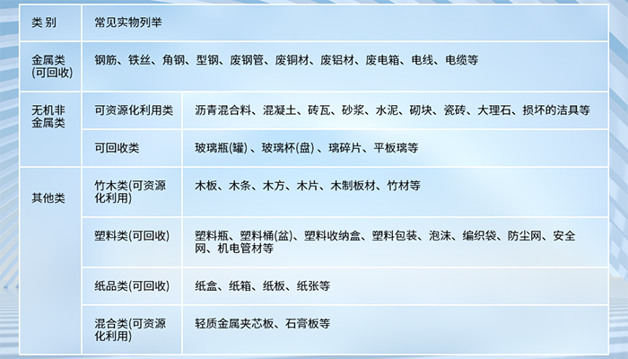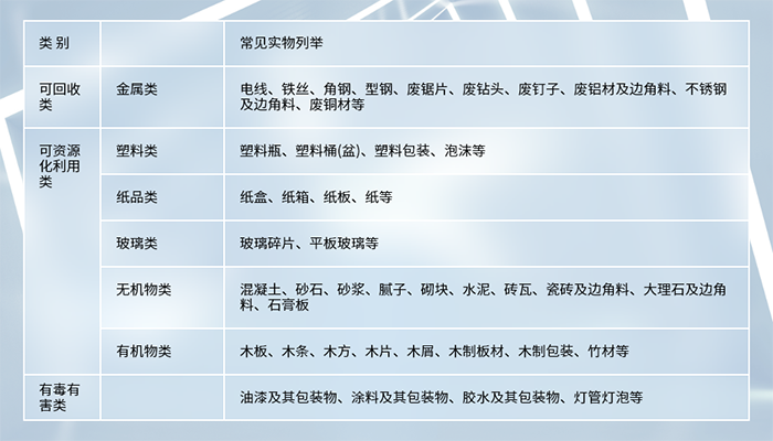 該目錄所規定的建築垃(lā)圾,不包(bāo)括工程施工(gōng)或拆裝活動(dòng)中產生的危險廢物、工業固體廢(fèi)物、生(shēng)活垃圾(含大件垃圾)。施(shī)工或拆裝現場產生的廢礦物油、廢塗料、廢粘合劑、廢密封劑、廢瀝青、廢石棉、廢(fèi)電池等危險廢物,按照《國家危險廢物名錄》的規定執行;工業固體廢物按照工業固體廢物的標準(zhǔn)規定執行;生活垃圾(含大件垃圾),按照《浙江省城鎮生活垃(lā)圾分類標準》(DB33/T 1166-2019)的規定執行。