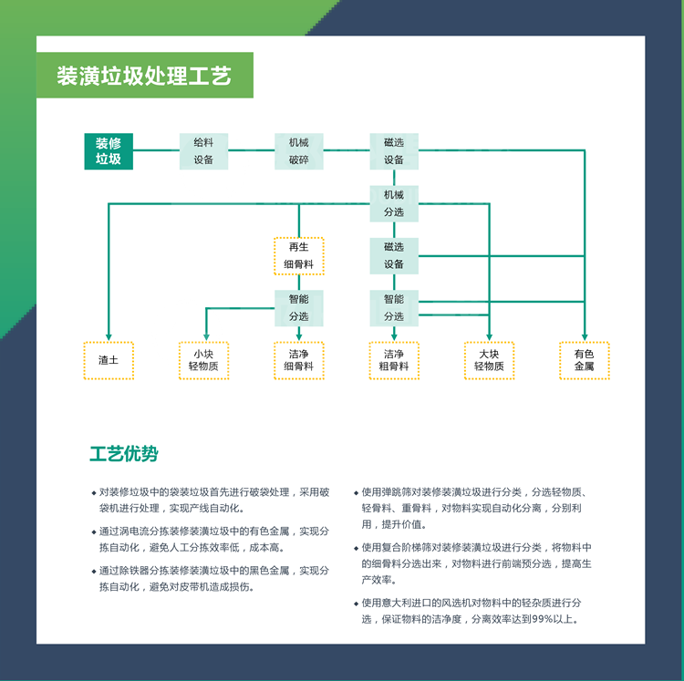 隨著我國國民(mín)經濟和社會的發展(zhǎn),裝潢垃圾產生量在迅速增加,在我(wǒ)國的城鎮中(zhōng),以建築裝飾工程(chéng)垃圾等固體廢物(wù)的收集、運輸、處(chù)理(lǐ)與處置、分類與分選、資源化循環利用等,不僅是當(dāng)地政府的重要日常工作,也是當(dāng)今社會可持續發展的核心內容。
