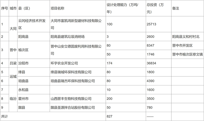 規劃近期建設建築垃圾資源化處理設施一覽表(biǎo)