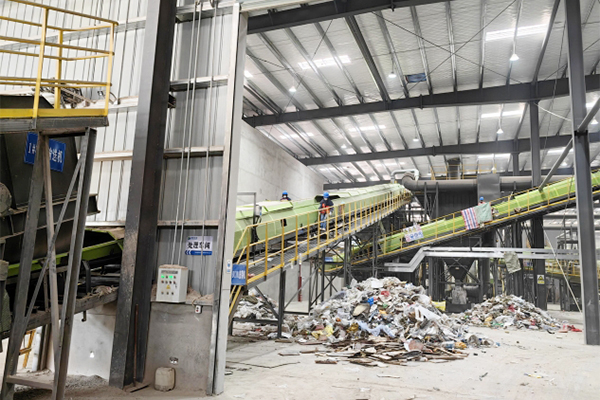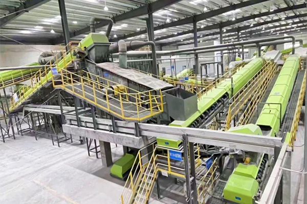 具體為“鏈板輸送機+階梯篩+磁選+人工分揀+複合篩+箱式風選+磁選+人工分揀+反擊破(pò)碎+磁選+圓振篩”的綜合(hé)處理工藝,把建築裝修(xiū)垃圾經過處理後得(dé)到三種粒徑的骨料回收利用,金屬回收外售,灰土填埋處置或品質較好利用其製磚,分選出約輕(qīng)物質中木材、塑料等資源回收,剩(shèng)餘細小輕質雜物送焚(fén)燒廠處(chù)置。圓振篩後端預留2台(tái)輕物質分(fèn)離器位置,分別用於風選0-5mm、5-12mm兩種物料。12-31.5mm、≥31.5mm物料設(shè)置返料皮帶,可返回至反擊破碎機,返料皮帶兩側預留兩工(gōng)位人工分揀平台。實現建築垃圾的“減量化、無害化,資源化”處理。