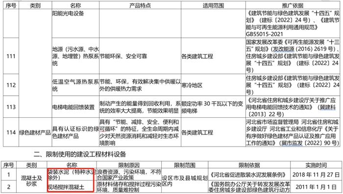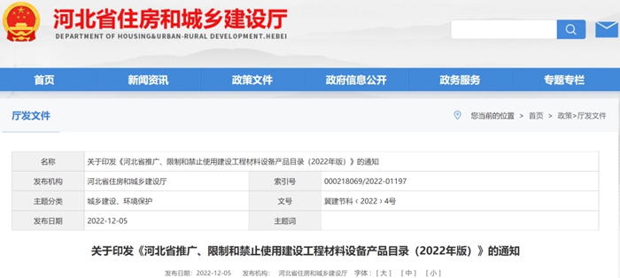 為推廣應用綠色節能(néng)環保型材料設(shè)備,促進建設工程品質提升,推動城鄉建設綠色發(fā)展。近日,河北省住建廳印發《河(hé)北省推廣(guǎng)、限(xiàn)製(zhì)和禁止(zhǐ)使用建設工程材料設備產品目錄(2022年版)》(以下簡稱《目錄(lù)》),同時(shí)廢止《河北省推廣、限製和禁止使用建設工程材料設備(bèi)產品目錄(2018年(nián)版)》。