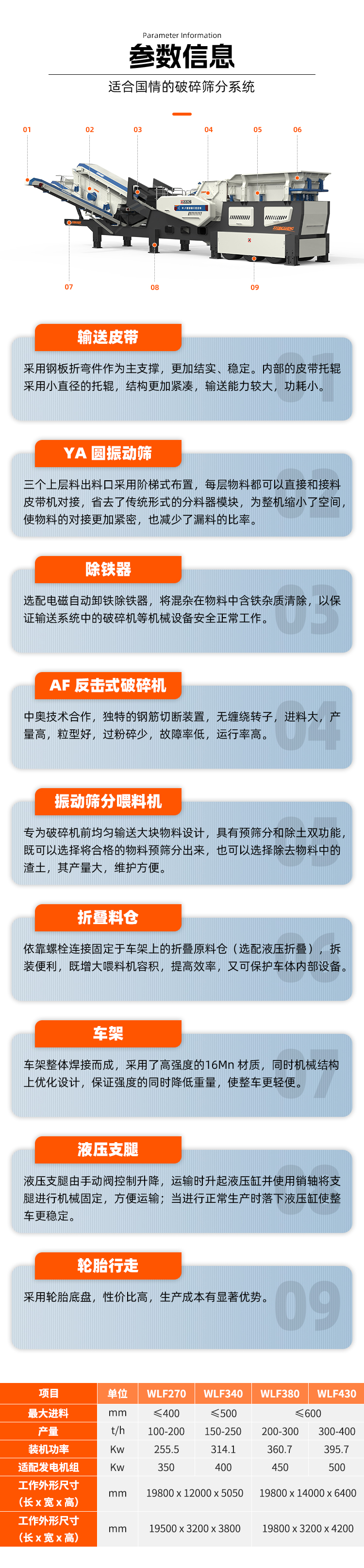 設備配置:WLF輪胎式破碎篩分聯合一體車